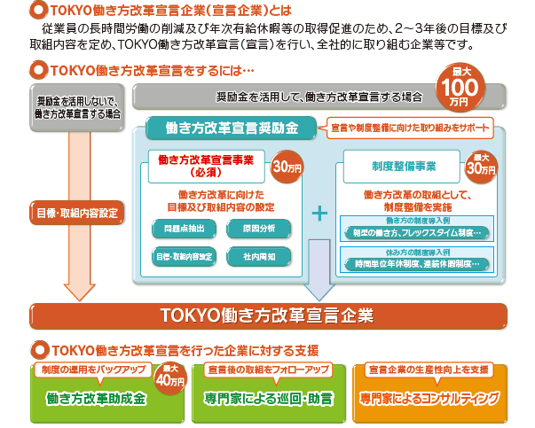 東京都では、都内企業の働き方改革の気運を高めていくため、働き方や休み方の改善に向けて、「働き方改革宣言」を行う企業等を募集し、様々な支援を行う「TOKYO働き方改革宣言企業」という制度があります。