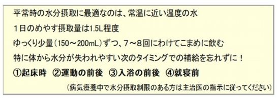 脱水や熱中症は屋外だけでなく屋内にいても起こります。室温が28℃を超えないよう、エアコンや扇風機を上手に使ったり、日頃から栄養バランスのよい食事や十分な休息をとり、暑さに負けない体をづくりをしていくことも、脱水や熱中症の予防になります。できることから実践して、元気な夏を迎えましょう!